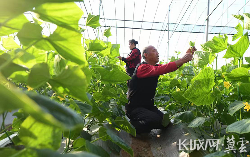 农民在东八里乡上八里村蔬菜大棚里给黄瓜捆绑枝蔓。通讯员 孙慧军 摄