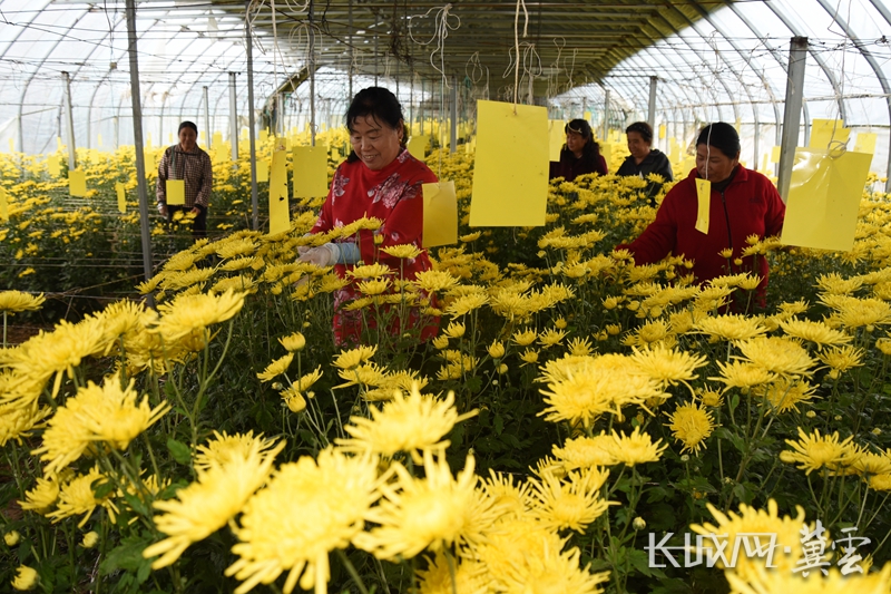 “除烧坡里村外,我们还在段家堡、牛心山两村公路沿线布局3座大棚,共种植约1.4万株金丝皇菊。为保障品质,我们在棚内悬挂粘虫板,杜绝喷洒杀虫药。”项目负责人孙俊喜说。